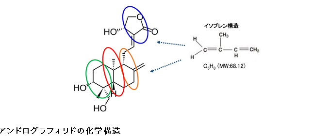 アンドログラフォリドのジテルペン構造は、4つのイソプレンによって構成され、抗細菌性および抗炎症性に働くことが知られている。