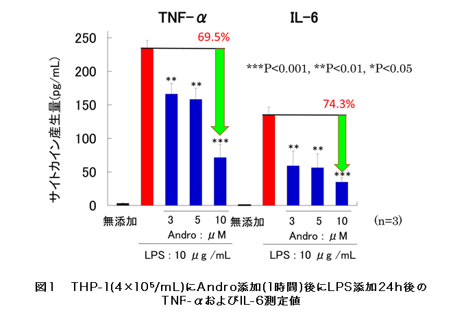 図1はTHP-1細胞を4×105個/mLに調整し、アンドログラフォリド濃度を終濃度3,5,10μMとなるように添加し、37℃で24時間培養した後にアンドログラフォリド未添加対照としたTNF-αおよびIL-6の産生量をそれぞれの培養液から測定した。